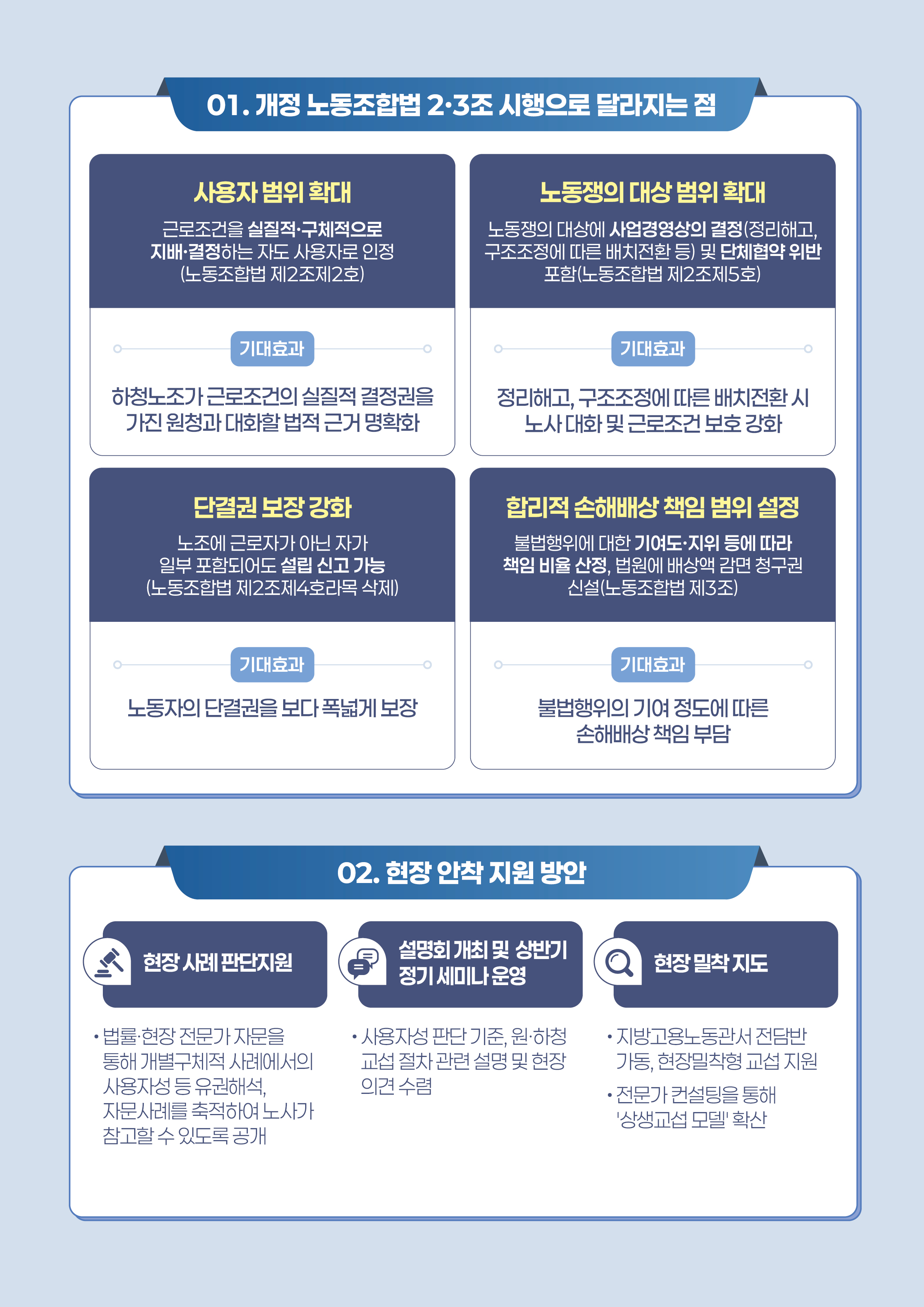 이번 법 시행으로 근로계약 당사자가 아니더라도 근로조건에 대해 실질적이고 구체적으로 지배·결정할 수 있는 지위에 있는 자는 그 범위에서 사용자로 인정된다. 이에 따라 하청노동조합이 자신의 근로조건에 실질적 결정권을 가진 원청과 대화를 요구할 수 있는 기반이 보다 분명해진다. 또한 노동쟁의 대상도 확대되어, 근로조건에 영향을 미치는 사업경영상의 결정이나 명백한 단체협약 위반도 노동쟁의의 대상이 될 수 있게 된다. 정부는 ‘근로조건에 영향을 미치는 사업경영상의 결정’은 정리해고, 구조조정에 따른 배치전환 등이 해당한다고 밝히고, 지난 2월 「개정 노동조합법 해석지침」 확정을 통해 이러한 변화가 현장에 일관되게 적용될 수 있도록 했다. 또한 노동조합법 제2조제4호라목을 삭제하여, 근로자가 아닌 자가 일부 포함되었다는 이유로 근로자가 주체가 되어 설립된 노동조합의 설립 신고를 반려하지 않도록 하여 단결권을 보다 폭넓게 보장하고자 하였다. 노동조합법 제3조 개정으로 쟁의행위에 따른 손해배상 책임과 관련한 제도도 달라진다. 법원이 조합원 등의 쟁의행위 등으로 손해배상책임을 인정하는 경우 부진정연대책임 하에서 노동조합 내 지위와 역할, 쟁의행위 참여 경위와 정도, 손해 발생에 대한 관여 정도, 임금 수준과 손해배상 청구금액, 손해의 원인과 성격 등에 따라 책임비율을 정하도록 하였다. 아울러 노동조합과 근로자로 하여금 법원에 배상액의 감면을 청구할 수 있도록 하며, 나아가 사용자가 쟁의행위 등으로 인한 손해배상책임 등을 면제할 수 있다는 규정 등을 신설하여 노사분쟁의 원만한 해결을 도모하였다. < 개정법 취지 구현을 위한 제도 안착 지원 > ① 단체교섭 판단지원 위원회 운영 정부는 개정법 시행 초기, 현장 혼선을 최소화하고 예측가능성을 높이기 위해 단체교섭 판단지원 위원회를 운영한다. 위원회는 법률전문가와 현장전문가가 참여하는 정부 유권해석 자문기구로서, 원·하청 관계에서의 사용자성 여부 등 실제 교섭 과정에서 반복적으로 제기될 수 있는 주요 쟁점에 대해 판단 기준과 방향성을 제시하게 된다. 고용노동부는 관련 훈령을 제정하여 위원회 운영의 기반을 마련하였으며, 자문사례를 축적·정리해 공개함으로써 개별구체적인 사례에 대해서도 기준을 마련해 노사 모두가 참고할 수 있도록 지원해나간다.(위원 구성명단 붙임1 참고) ② 개정 노동조합법 설명회·세미나 개최 아울러 고용노동부는 법 시행 초기 기업 현장의 이해도를 높이기 위해 3월 중 개정 노동조합법 설명회를 개최하고, 상반기 동안 정기 세미나를 운영할 계획이다. 설명회와 세미나에서는 개정법의 주요 내용, 사용자성 판단, 교섭절차 운영 등 핵심 쟁점을 중심으로 현장 적용 방향을 공유하고, 단체교섭 판단지원 위원회의 자문사례와 판단기준도 함께 안내함으로써 실무 지원을 강화한다. 또한 기업, 노동조합, 법률전문가 등 다양한 주체가 함께 참여할 수 있도록 하여 제도 변화에 대한 이해를 제고하고, 실제 발생할 수 있는 사례를 중심으로 토론을 진행하는 등 현장의 의견을 폭넓게 수렴해 나갈 방침이다. ③ 현장 밀착 지도를 통한 원활한 교섭절차 지원 고용노동부는 지방관서를 중심으로 전담반을 구성·운영하여, 해석지침과 교섭절차 매뉴얼을 토대로 원·하청 교섭절차를 적극 안내하는 한편, 실제 현장 교섭에 대해서도 신속히 적시에 대응해 나간다. 일선의 지방관서 감독관들이 원·하청 간 쟁점이 발생할 가능성이 높은 사업장을 선제적으로 지도하고, 하청노조의 교섭요구 시 원·하청 노사관계와 현장 여건을 종합적으로 고려하여 교섭단위 분리, 창구단일화 등 법적·절차적 사항을 충실히 안내함으로써, 제도적 틀 안에서 원청과 하청노조 간 대화가 합리적으로 이루어질 수 있도록 교섭을 촉진한다. 아울러 노사 간 공감대가 형성된 경우에는 전문가 상생교섭 컨설팅을 통해 안정적으로 실제 교섭에 이를 수 있도록 지원하고 모범적인 상생교섭 모델도 마련하여 지속 확산해 나갈 계획이다. 한편, 정부도 공공부문에 대해서 모범적 역할을 수행해나간다. 공공부문 교섭 요구에 대해 책임있는 자세로 노동계의 요구를 충분히 수렴하여 소통·협의하고, 관계부처와의 협업을 상시화하여 공공부문의 근로조건과 처우를 개선할 수 있는 실효적인 방안 등을 검토해나간다. 아울러 공공부문에서 선도적 노사관계 모델을 만들어 나감으로써, 현장에 신뢰를 쌓고 민간 부문으로의 확산에도 긍정적인 기반이 될 수 있도록 지원해나갈 예정이다.
