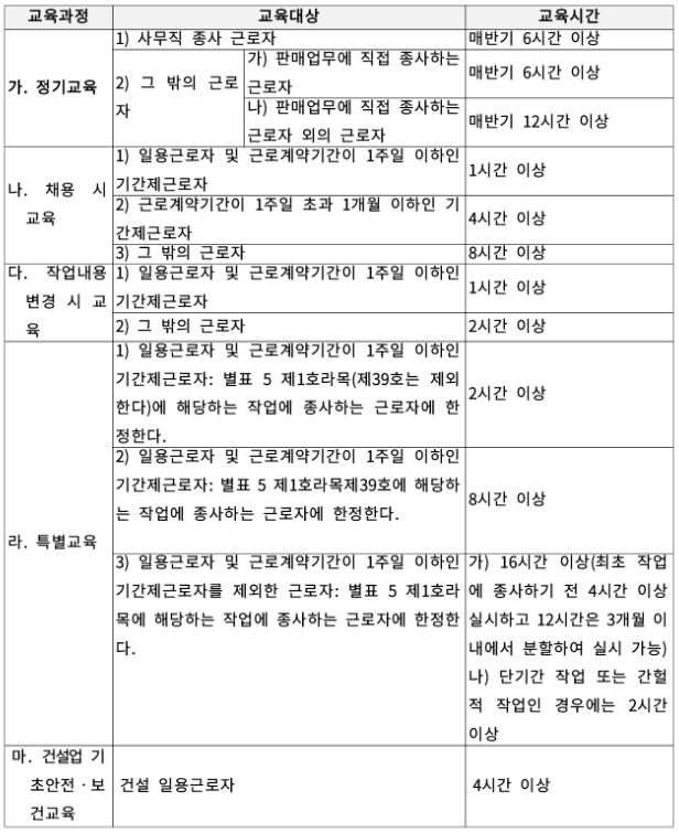 - 주기: 아래 표 참조 (관리감독자, 안전보건관리책임자등의 경우 별도로 교육시간이 정해져 있어 확인이 필요합니다)